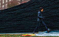 Artist Orly Genger ’01 constucts a meandering woven sculpture on the Front Green.