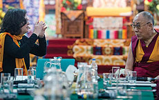 Assistant Professor Catherine Kerr explains her work studying the brain and meditation to the Dalai Lama in December.