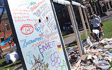 The German studies department marked the twentieth anniversary of the fall of the Berlin Wall and were given hammers to smash their facsimily in solidarity.