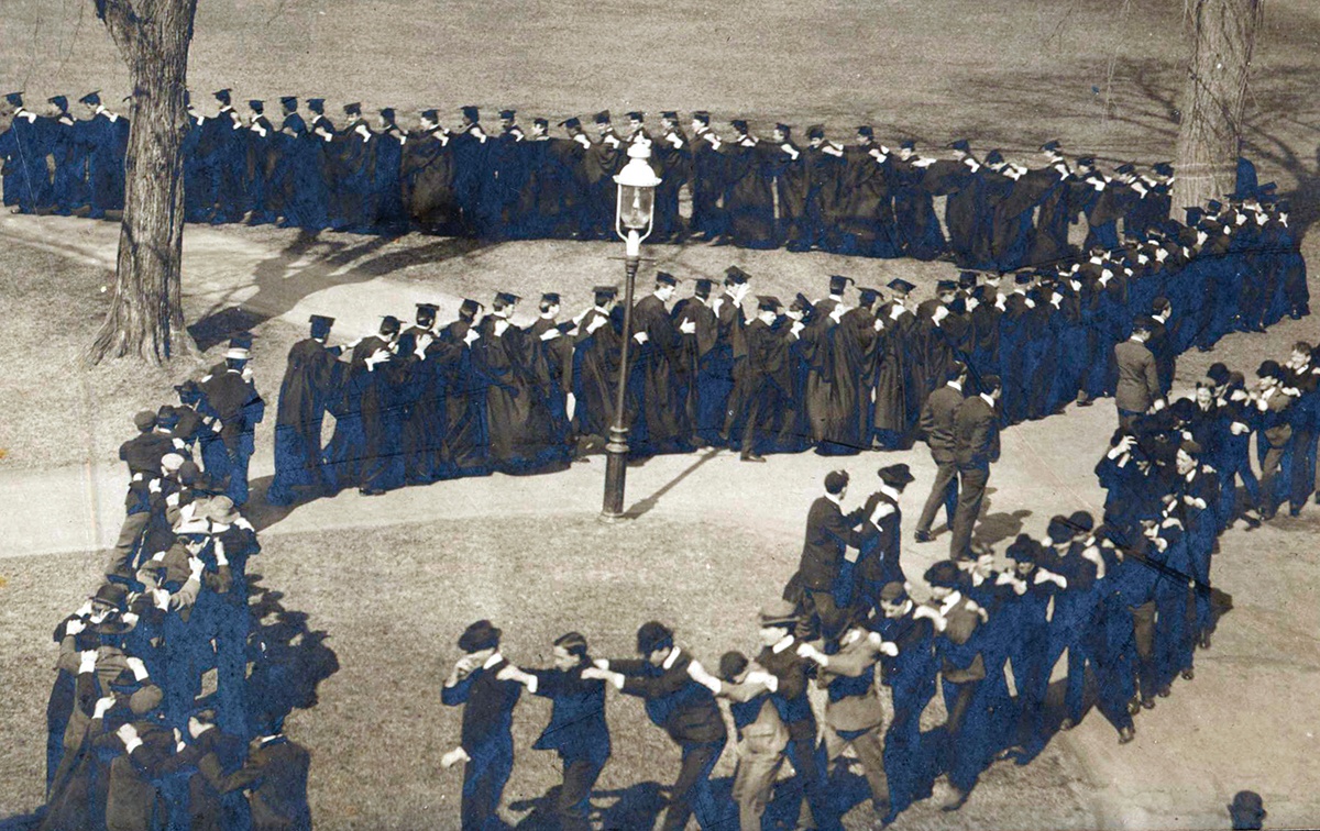 Back off, Bunny Hop At Camp Bruno in the early 1900s, the first day of the spring term was celebrated by the snake dance, a serpentine line of seniors in caps and gowns—hold the hop. “This term is the time for many seniors to make their work as light as possible and to thoroughly enjoy the remainder of their course,” the Brown Daily Herald said in 1902, when this photograph was taken. Spring Day exercises endured in various forms into the 1960s, often incorporating a note of humor, from witty speeches to “mascots” that referred to class jokes.
