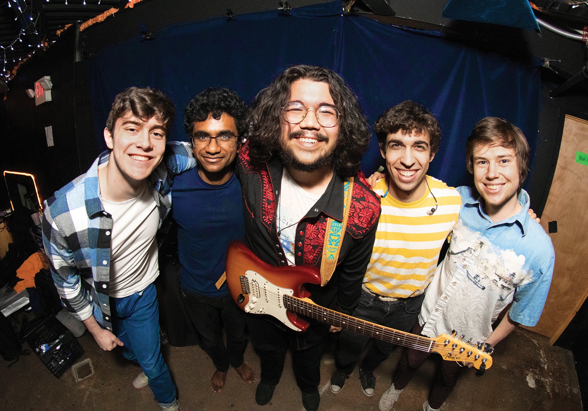 Will Beakley ’23, Sannivas Reddy Nallamanikalva ’24, Chance Emerson ’24, Jack Riley ’23, Satch Sumner-Waldman ’23. Backstage at Fête, Providence, March 2022.Photo: Small Frye Photography