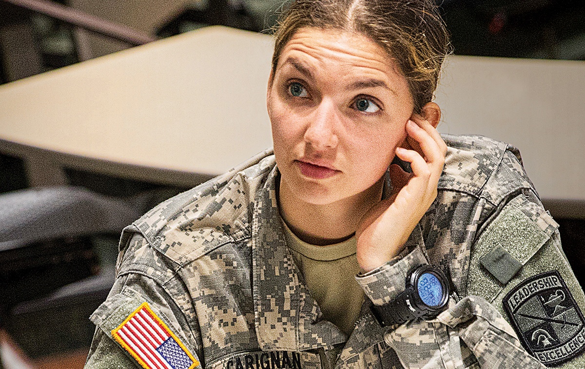 At 8 a.m., the classroom falls silent, all eyes turned expectantly toward the two people seated center stage. One is Lieutenant Colonel Tyler Jones, one of only two people in the room over 25 and a mirror image of what these ruddy, buzzcut young men will look like two decades from now. The other is the Patriot Battalion Commander, 22-year-old Catherine Carignan ’20.